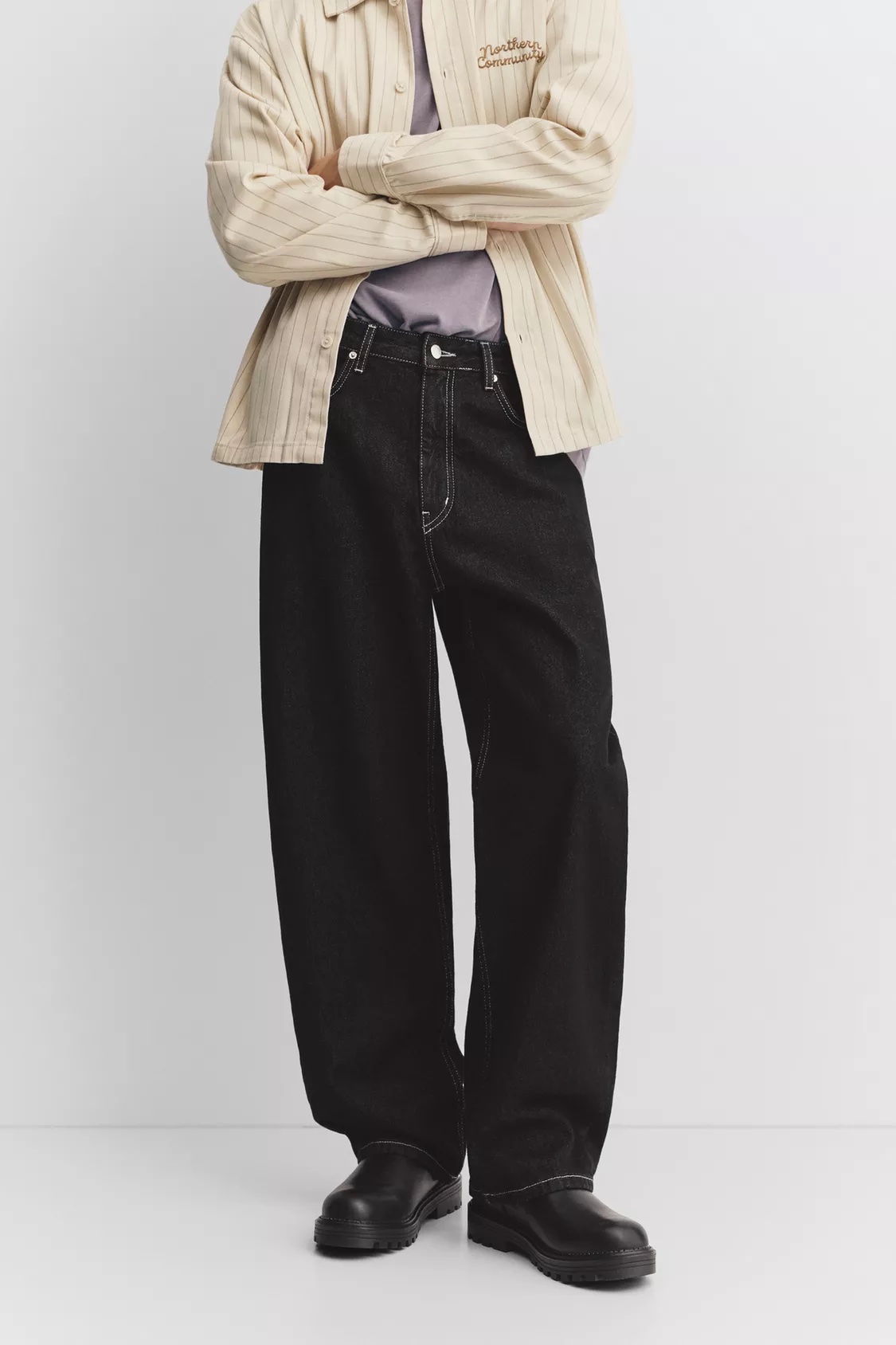 Crafted from a durable, heavyweight denim in a deep indigo-black wash, these pants stand out thanks to their striking white contrast topstitching. This detail highlights the construction and adds a graphic, architectural edge to the piece. The loose, wide-leg cut provides a comfortable, unrestrictive fit that pools perfectly over sneakers or chunky boots. Whether paired with a simple tee or layered under an unbuttoned chore shirt, these jeans offer an effortless, “cool-without-trying” vibe.