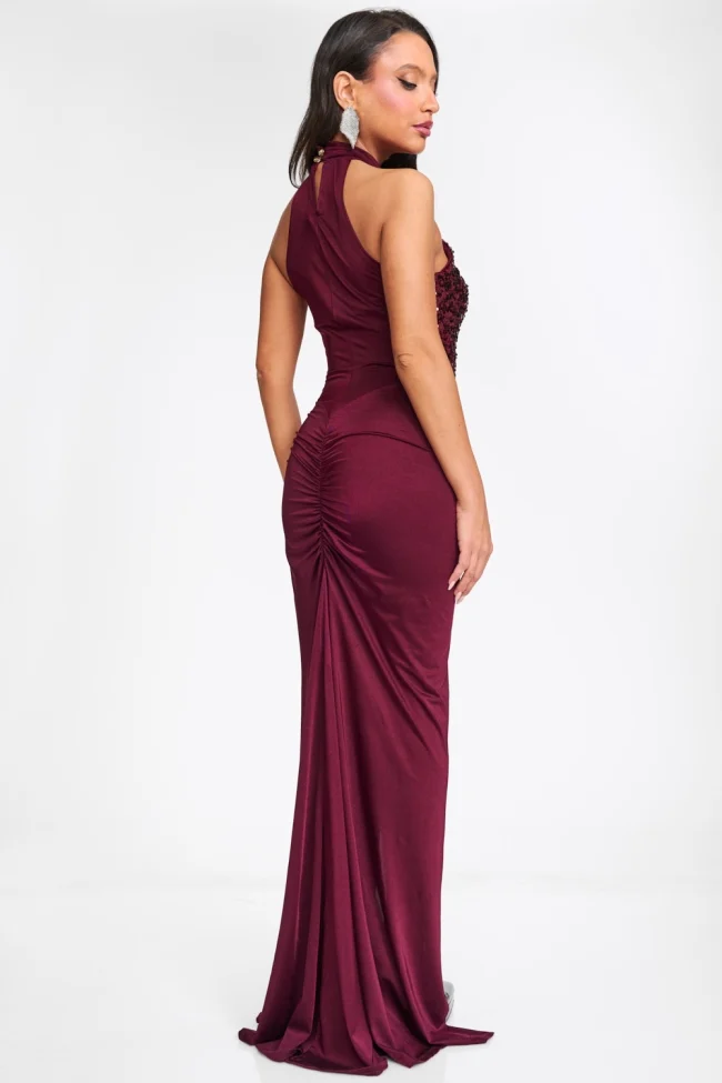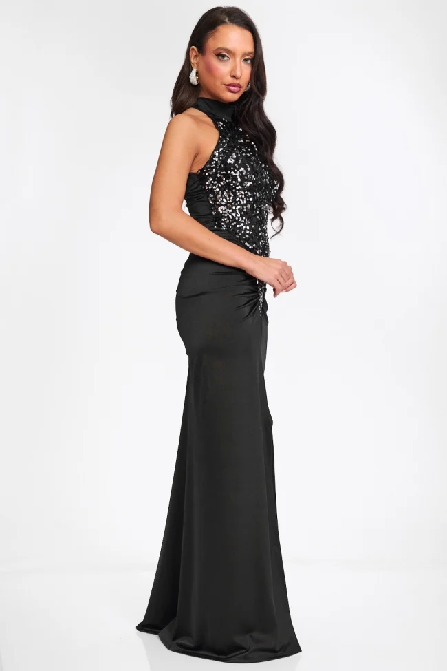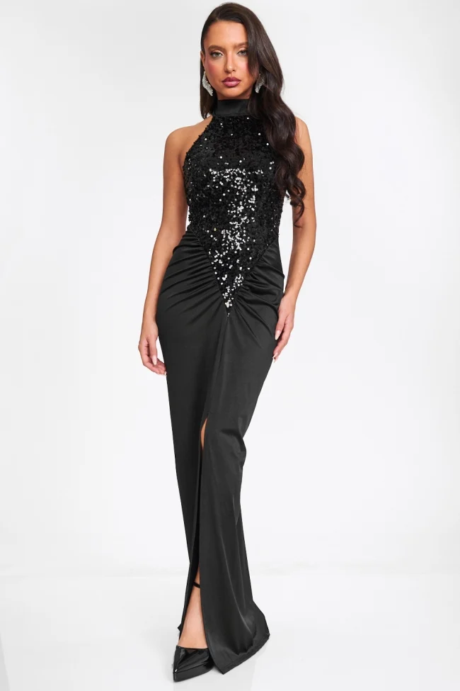 Description: Make an unforgettable entrance with this breathtaking maxi dress, designed for those moments that demand glamour. The bodice features a dazzling display of sequins arranged in a plunging V-shape that catches the light from every angle. The high halter neckline adds a touch of timeless elegance, while the skirt is crafted from smooth, stretch fabric that drapes effortlessly to the floor.