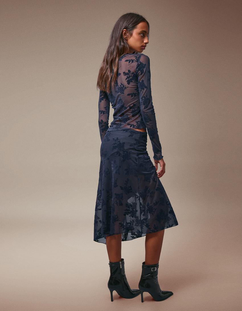 Step into an ethereal, gothic-inspired aesthetic with this stunning navy blue midi skirt. The design is centered around a delicate, sheer mesh fabric that feels light and airy against the skin. Elevating the sheer base is an all-over flocked floral pattern, providing a velvety texture and a rich, monochromatic depth to the deep blue hue.