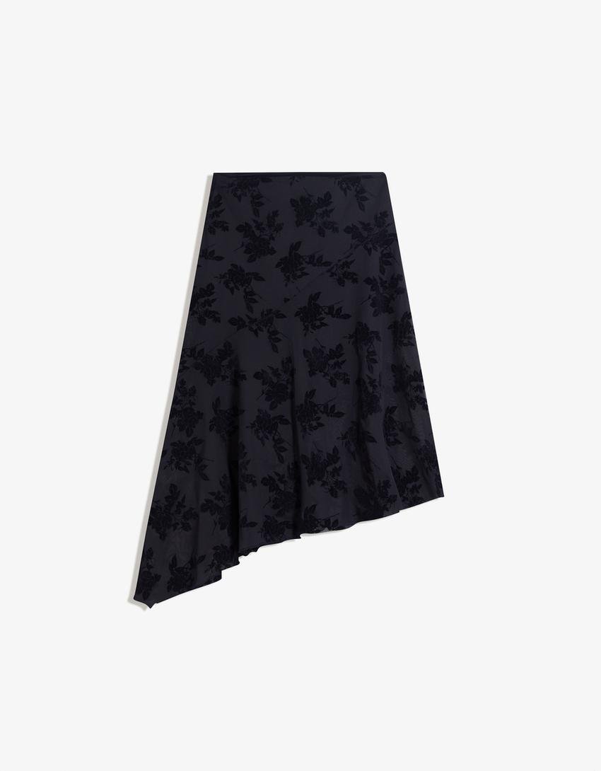Silhouette & Movement This skirt is designed to create movement. It features a dramatic asymmetric hemline that cuts diagonally across the legs, tapering from a shorter length on one side to a longer point on the other. The fit hugs the hips gently before flowing out, creating a flattering silhouette that sways as you walk.