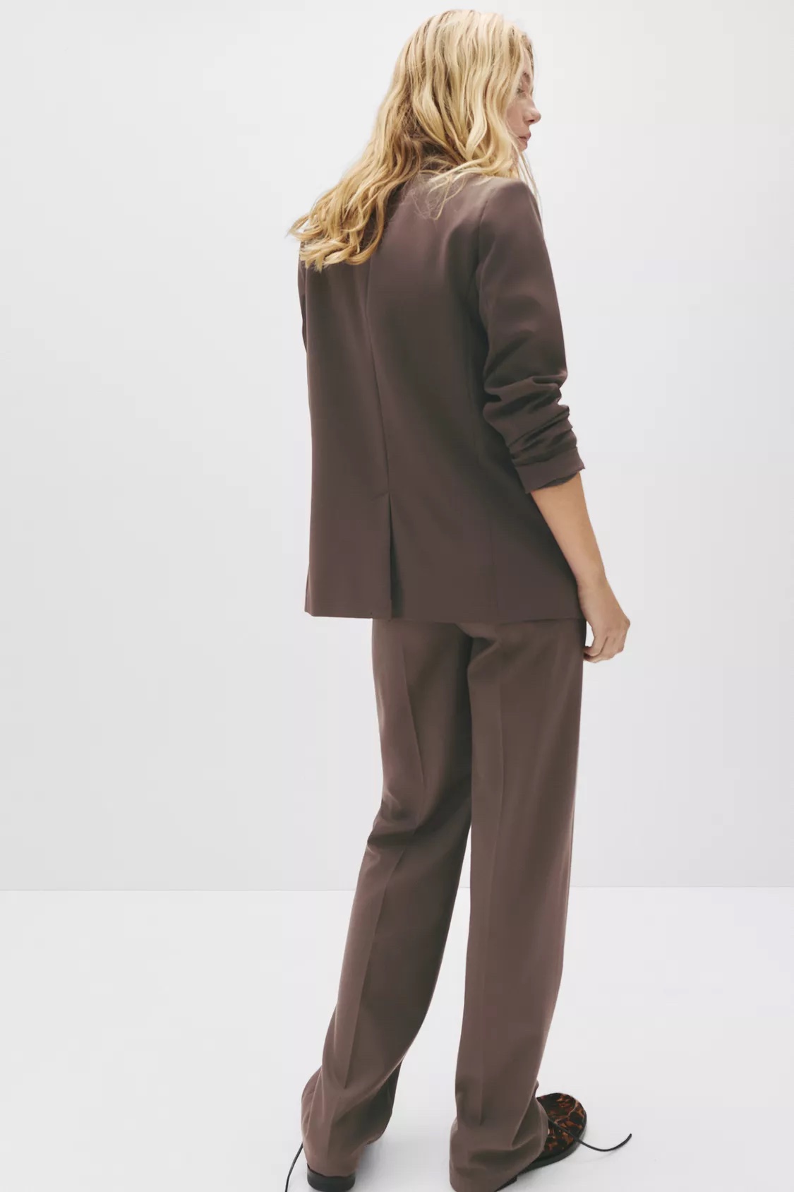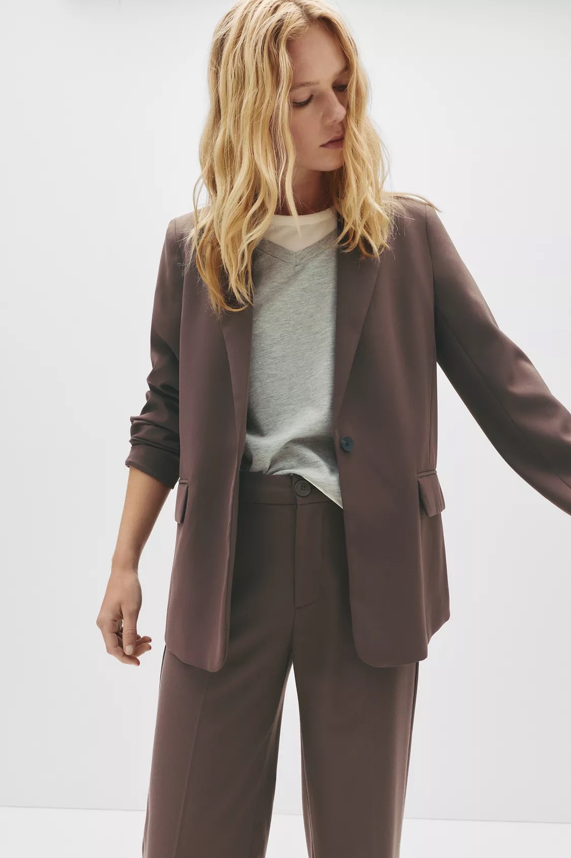 Crafted from a smooth, mid-weight fabric that drapes beautifully, this piece features a clean single-button closure and sharp notched lapels for a minimalist aesthetic. The slightly dropped shoulders and loose fit provide a modern, “borrowed from the boys” look that feels both comfortable and high-fashion. Whether you pair it with the matching wide-leg trousers for a powerful tonal suit or throw it over a simple tee and jeans, this blazer serves as the ultimate versatile layering essential for the modern wardrobe.