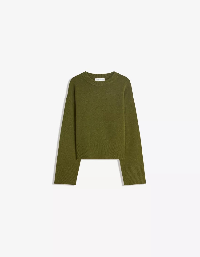 Expertly crafted from a soft, medium-weight knit fabric, this sweater is designed to provide warmth while maintaining a comfortable, lightweight feel. It features a timeless crew neckline and dramatic, wide sleeves that enhance its relaxed aesthetic. The intentional cropped length is complemented by a deep ribbed hem and matching elongated cuffs, creating a structured yet cozy profile. Whether you choose the bold Red or the earthy Olive, this sweater is the ultimate investment piece for layering over collared shirts or pairing with high-waisted denim and mini skirts.