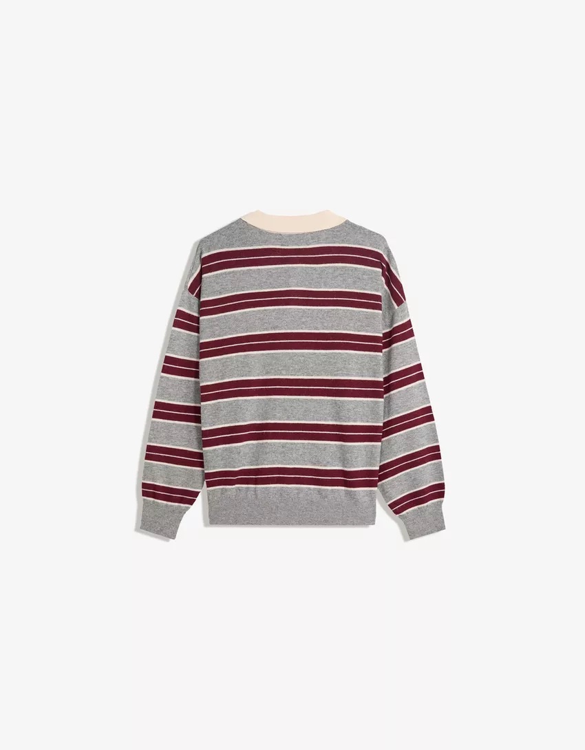 Designed with a soft, medium-weight knit fabric, this sweater features a timeless horizontal stripe pattern in grey, burgundy, and white. The design is elevated by a contrasting cream-colored polo collar and a delicate three-button placket, offering a refined yet laid-back look. Its slightly oversized fit and dropped shoulders provide a contemporary drape, while the ribbed cuffs and hem ensure the garment retains its shape. Whether paired with a mini skirt and loafers for a preppy urban vibe or layered over relaxed denim, this polo sweater is the perfect investment for a polished, off-duty aesthetic.