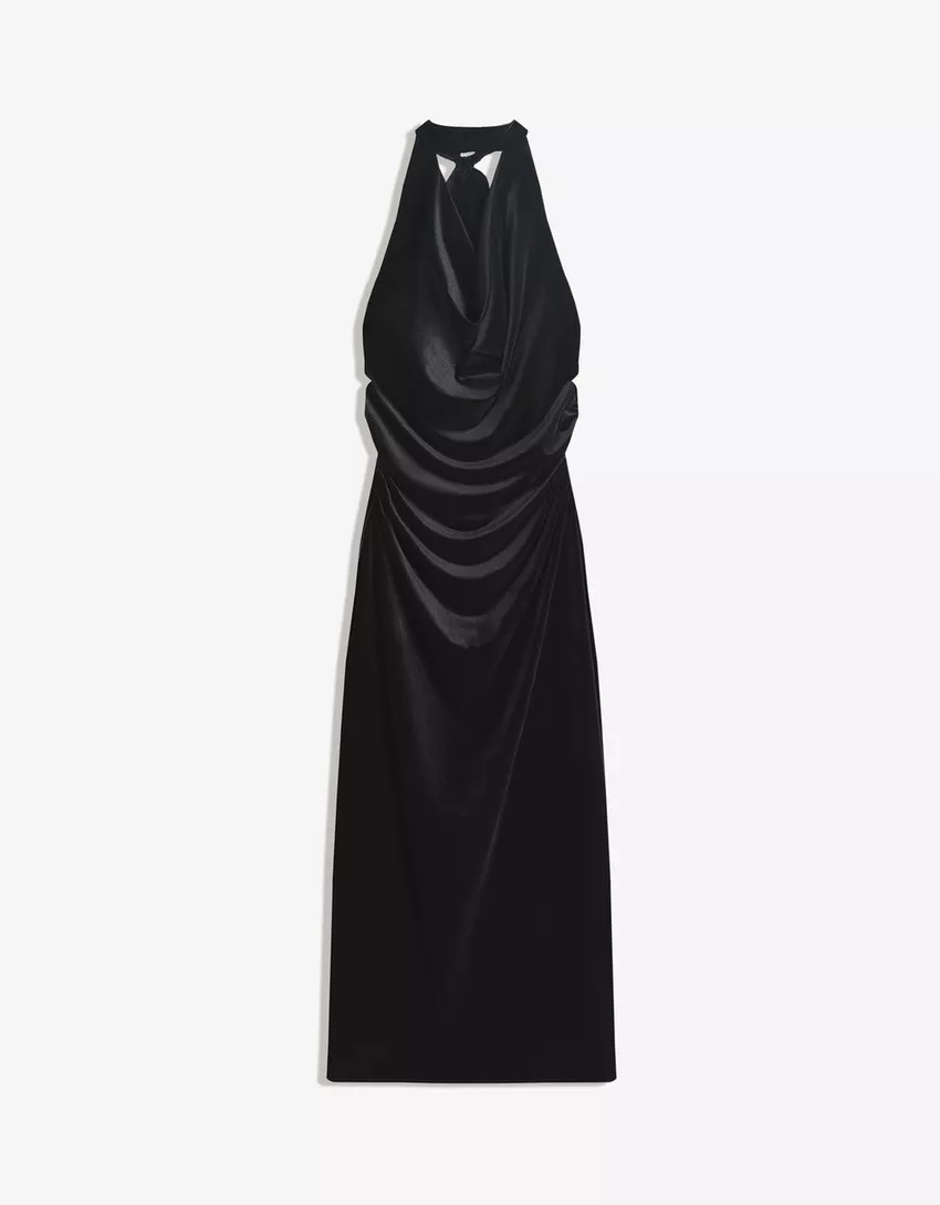 Neckline: Sophisticated halter neck with a draped cowl front for a classic, feminine look.