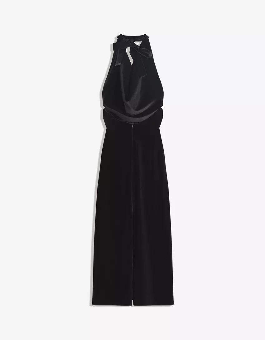 Crafted from premium, high-stretch velvet, the dress is designed to hug the body while providing a comfortable and flattering fit. The elegant halter neckline features a dramatic cowl front that adds soft, fluid volume, balanced by a sleek, body-con skirt. Intricate side ruching creates a draped effect across the midsection, enhancing the hourglass profile. The back is equally striking, featuring a large adjustable bow tie at the nape of the neck and a subtle center-back vent for ease of movement. Whether paired with statement earrings or minimalist stiletto heels, this deep black velvet dress is the ultimate choice for cocktail parties, galas, or winter weddings.